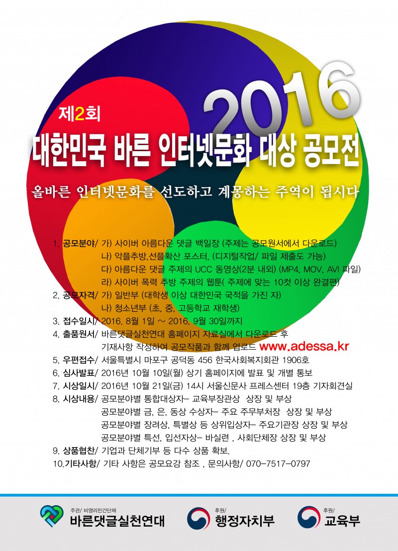제2회 대한민국 바른 인터넷문화 대상 공모전 페이지 정보 작성자 아댓사 작성일16-08-05 21:47 조회5,561회 댓글0건 이전글 다음글 목록 본문 댓글목록 등록된 댓글이 없습니다. 이전글 다음글 목록