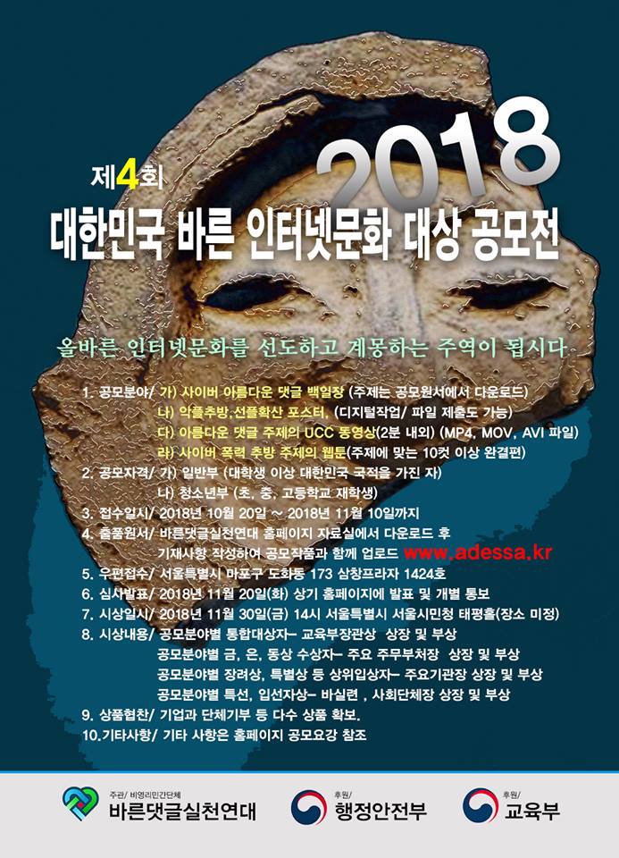 2018 제4회 대한민국 바른인터넷문화대상 공모전 페이지 정보 작성자 아댓사 작성일17-07-14 16:41 조회843회 댓글0건 이전글 다음글 목록 본문 포스터 댓글목록 등록된 댓글이 없습니다. 이전글 다음글 목록