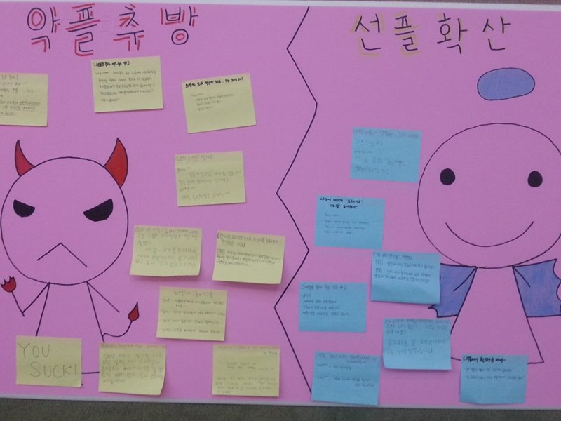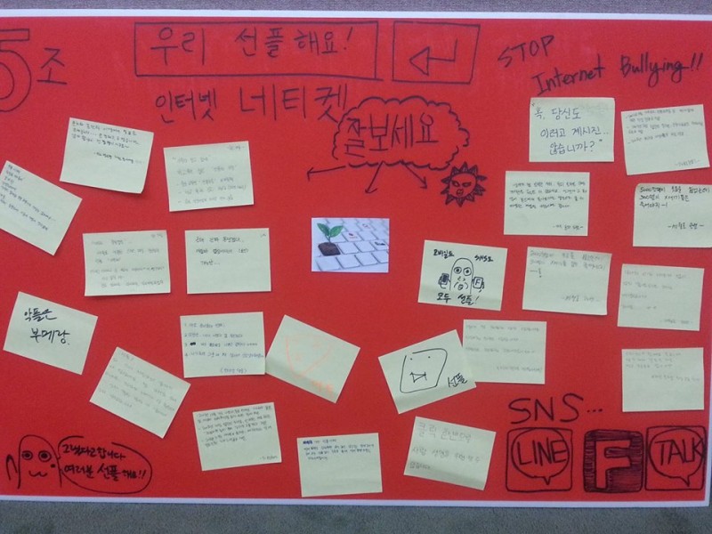 학생들이 조별로 나뉘어 선플확산에 대한 자신들의 생각을